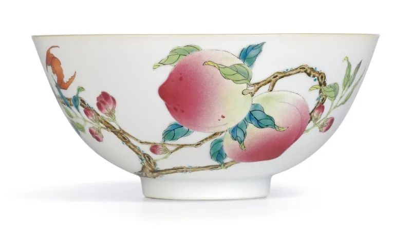 此雍正御瓷福寿双全图盌,珍罕至极,此盌绘五寿桃于外壁,独一无二,现知其他作例,均绘六桃,四桃于外,内壁双桃。桃实不带明显暗红轮廓线,为其另一特点,展现画师高超技艺,及粉彩新技术带来的突破。
