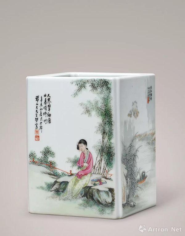此件陶瓷笔筒是何许人、王琦、汪野亭、王大凡四位艺术家在不同时期内完成的一件合力之作。有雪景的空寂,有老翁垂钓之乐,有世外高人的居所,有美女娇嗔含羞。“四友”合画品味丰富,耐人寻味。
