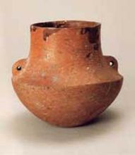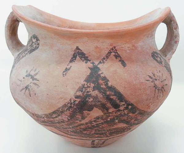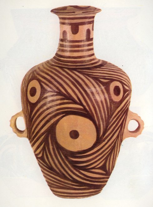 仰韶文化陶器(距今约7000年),1921年首次发现于河南省渑池县仰韶村而得名;在河南、山西、陕西等黄河中下游等地都有制作,以磨光红陶、彩陶为显著特征;图为著名的仰韶文化彩陶双耳瓶