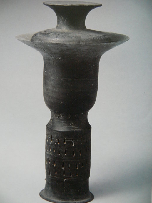 龙山文化陶器(距今约4000年),1928年首次在山东章丘龙山镇发展而得名;以蛋壳黑陶最著名。图为龙山文化蛋壳黑陶高足杯口径4CM。酒器。器壁最薄处仅0。5MM.