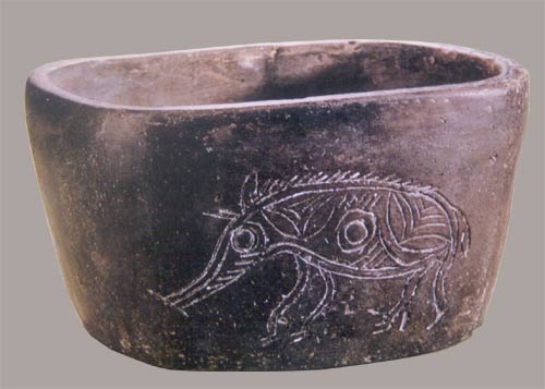 浙江余姚河姆渡文化陶器(距今约7000年),1973年首次在浙江余姚河姆渡村发现而得名;图为河姆渡文化黑陶刻猪纹钵
