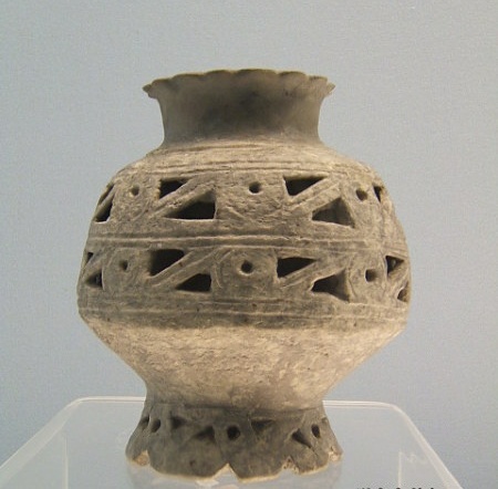 上海青浦崧泽文化陶器(距今6000左右)以灰陶、黑陶为多。图为崧泽文化黑陶镂空壶