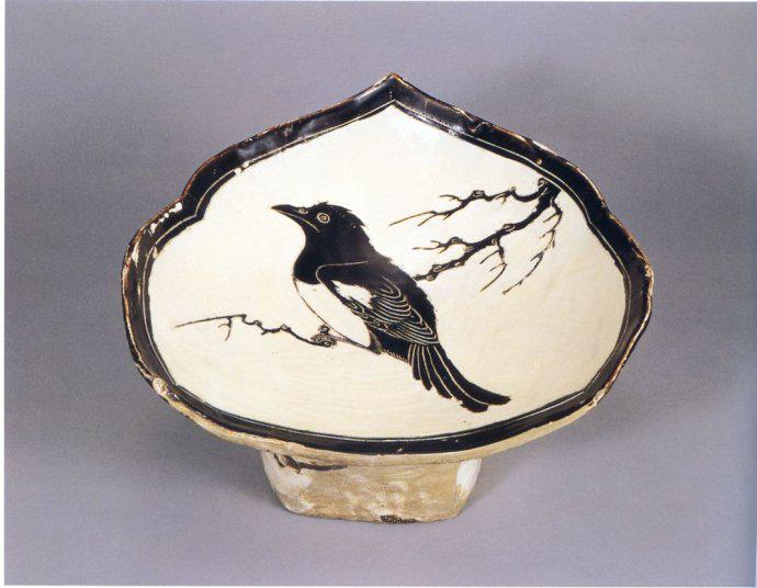 宋代磁州窑黑剔花鸟纹荷叶形枕