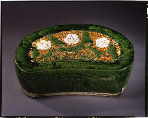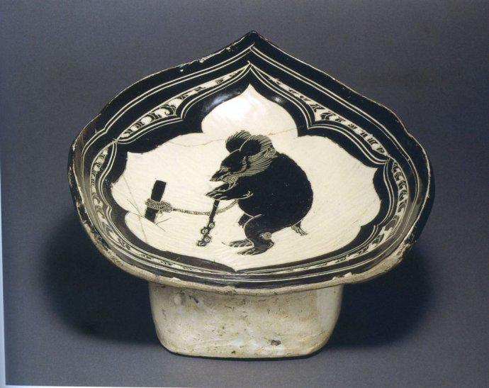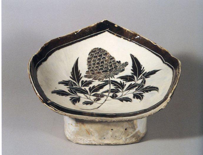 宋代磁州窑白地黑剔花牡丹纹荷叶枕,白色为化妆土上透明釉烧造的效果