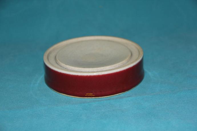 清康熙郎窑红圆砚底部,红釉垂流不过足,圈足、米汤釉、有极细开片。