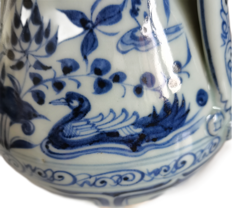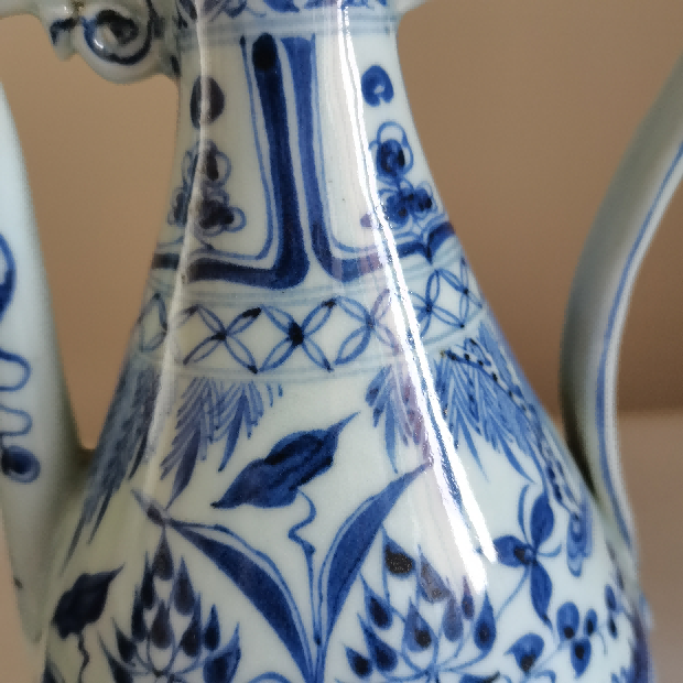 元代青花使用进口钴料(苏麻离青)与国产料的混合配方。进口料含高铁低锰,发色青翠浓艳,局部可见结晶斑(俗称“锡光”),而国产料青蓝偏灰,两者结合形成独特的层次感。执壶纹饰中常见的“铁锈斑”与自然晕散现象,正是苏麻离青料的典型特征。