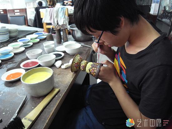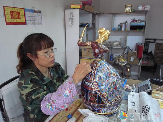 点蓝是依照图案所标示的颜色,用由铜丝锤制成的小铲形工具,一铲铲地填充入焊好的铜丝纹饰空隙中。