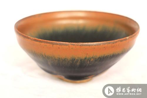 建窑乃宋代名窑之一,亦称“建安窑”、“乌泥窑”。窑址在福建建阳县水吉镇。以烧黑釉瓷闻名于世。小碗最多,胎骨乌泥色,釉面多条状结晶纹,细如兔毛,称“兔毫盏”。也有烧成“鹧鸪斑”和“银星斑”的,别致美观。釉下毫纹,是利用酸性釉料所后成的酸化痕迹作装饰,因建窑瓷皆仰烧,釉水下垂,成品口缘釉色浅。由于器壁斜度不同,流速快,成纤细毫纹,流速稍慢则粗,就成兔毫之状。此件由商家“泛古阁”提供的南宋时期建窑作品,为一茶盏,敞口。通体黑釉,胎质细腻。盏壁上方施有金豪,修足精细规矩,底足有流釉痕迹。全品无修。品相完整,手头稳重。为南宋时期茶道精品。