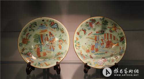 这对粉彩绿地人物盘,整体豆青釉底,上绘画粉彩人物,群贤祝寿图 盘四周绘画暗八仙,花卉 施彩艳丽,口沿施酱色釉。人物绘画精细,底款为大清嘉庆年制。直径17厘米,形体变化含蓄柔和,讲究线条的美感。在注重美观的同时还注重实用性,有端庄稳重之感。制作一丝不苟,讲究规矩方圆,注重细部处理。讲究彩料的层次变化,画面粉润柔和,突出画面的阴阳浓淡,富有立体感。 粉彩瓷器出现在我国康熙晚期,其因受珐琅器的影响而创烧的新品种。它以耀丽的色彩、温雅的气韵、卓尔不群的格调而备受文人雅士所青睐。随着人们生活水平的提高,买这样一对粉彩瓷盘摆放在家里,会增添无尽的美感,也会给人带来审美的愉悦,来源:雅昌艺术网