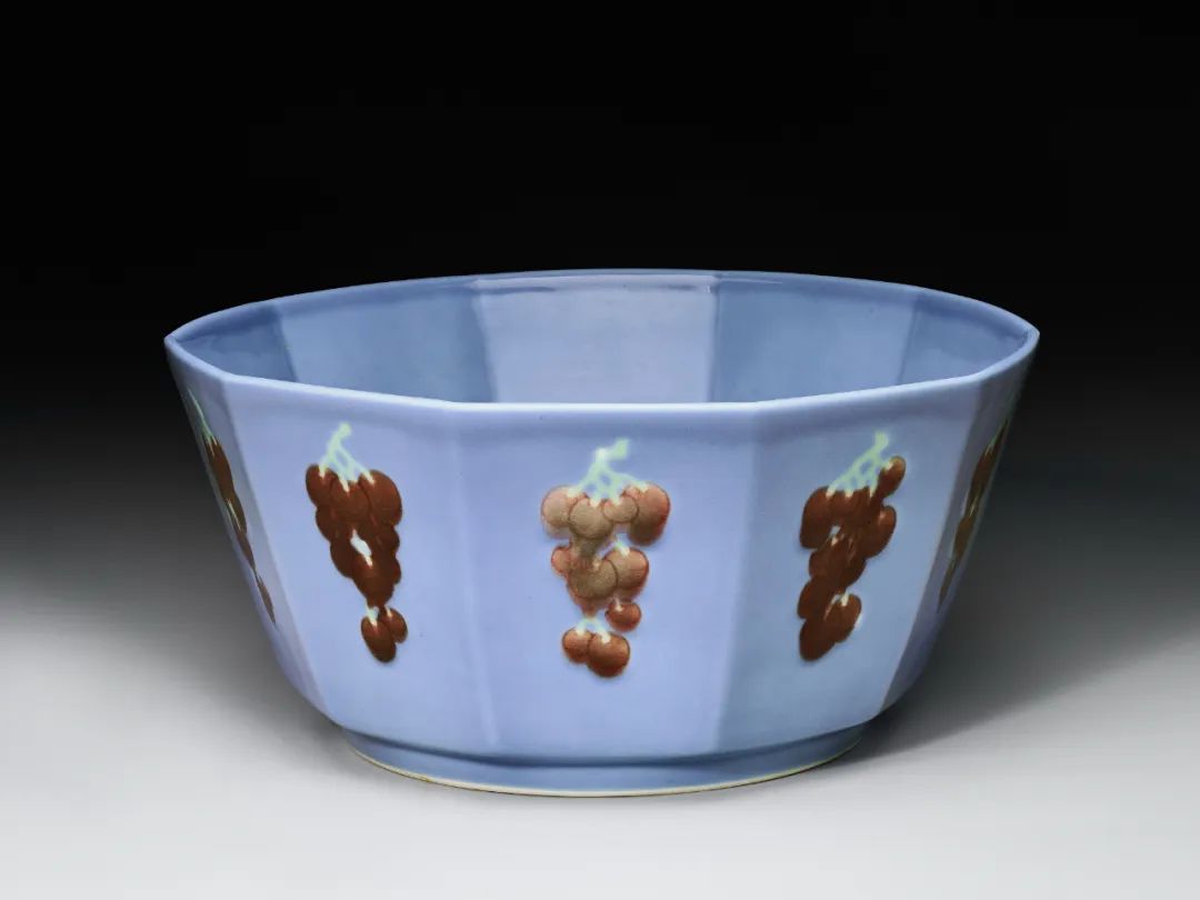 天蓝地豆青釉里红葡萄纹十棱碗