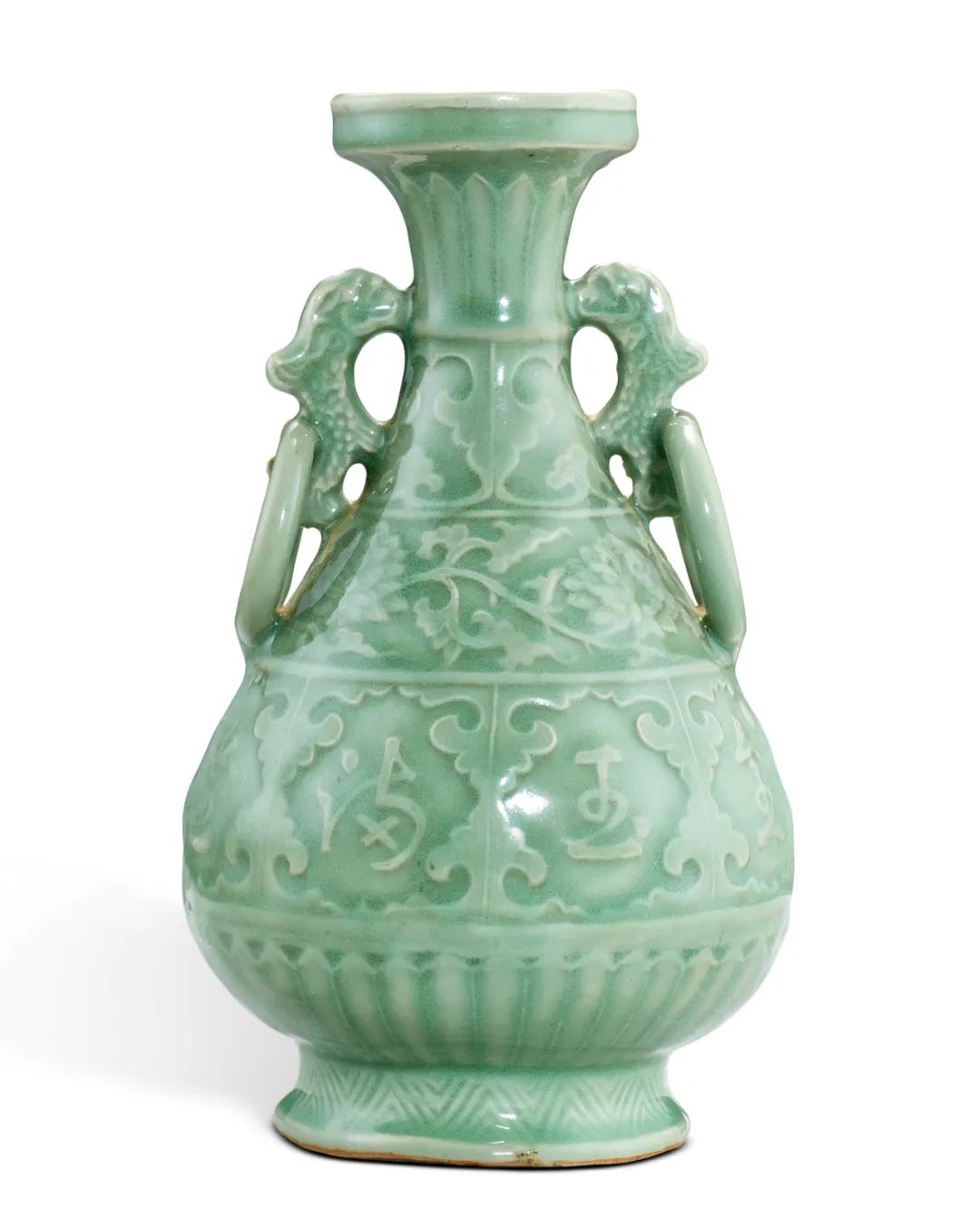 元至明 龙泉窰青釉印花金玉满堂龙耳衔环盘口瓶23 公分估价 600,000 - 1,200,000 港元