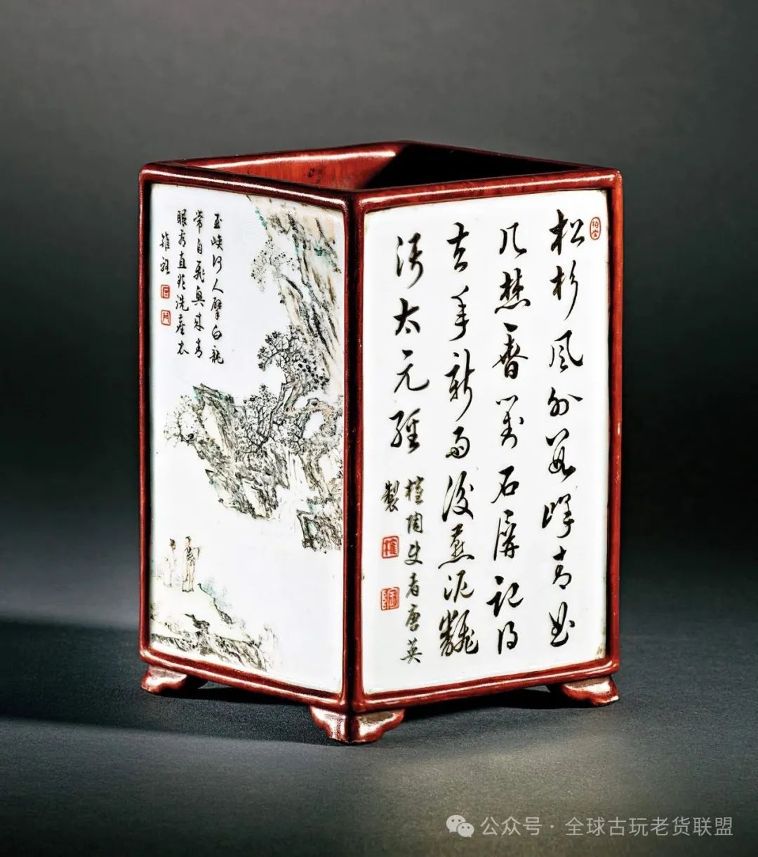 清乾隆 唐英亲制仿木纹釉开光设色山水诗文唱和四方笔筒成交价460万元