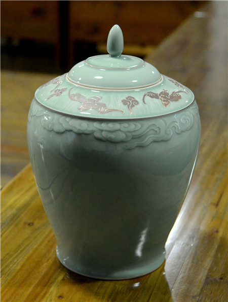 龙泉窑青釉五福祥云纹大罐 本版图片均为鲁光中摄