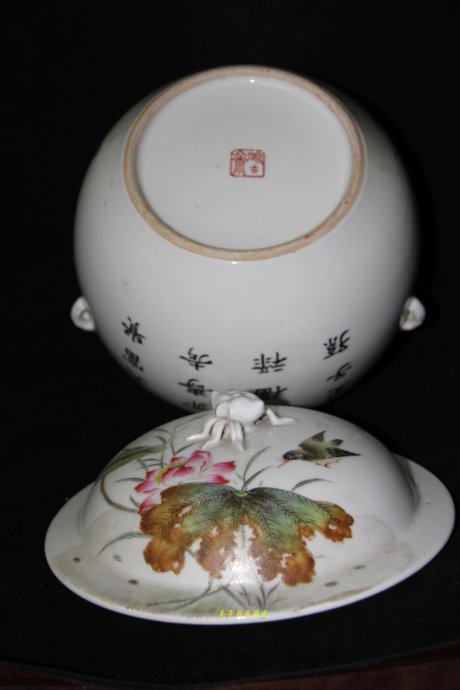 程意亭:中国陶瓷美术大师,他最早参与了“月圆会”的艺友聚会,亦是“珠山八友”早期的成员之一。1925年至1935年,是程意亭创作的黄金时期,传世的许多作品均是这一时期的创作,期间有一件作品曾在巴拿马国际博览会获奖。 程意亭花鸟画擅长工兼写,多以松鹤、荷塘、水鸟、紫藤、秋菊等为题材,善画花卉,多用逸笔。或奇或正,或率或工,或赋色,或晕墨,自然、生动、恬雅。程意亭的作品在笔法上多兼工带写,用笔飘逸洒脱且工整细腻;在赋色上清新雅丽、不浮不躁;在构图上奇中求正、穿插自如,错综而又空灵;在形象上刻画细腻入微,却又注重动势神态,突破了一般花鸟画的媚世艳俗、烦琐臃杂之弊端。程意亭的作品在构图上别具匠心。如以笔者收藏的这件盖罐而言,荷茎十字交叉——造险;以花蕾设在其间——求活,以飞鸟俯冲之姿——求动;以水鸟枝上停栖——置静,以荷塘衬于其后——回生。进而花叶形成“面”、茎杆形成“线”、水鸟形成“点”,传统的画面内涵着现代的形式美感,不愧是名家之高招,大师之手笔。