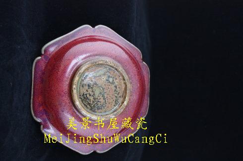 图为北宋钧官窑六棱洗,直径14.5厘米,器型秀美,制作规整。广口,折沿,浅腹,孤行腹壁有六条出戟线与棱口相对,洗内壁中施天青釉,“蚯蚓走泥纹”清晰可见。洗口沿呈玫瑰紫,外壁呈海棠红,色彩绚丽,十分难得。底釉呈芝麻酱釉色斑块,有支订痕。