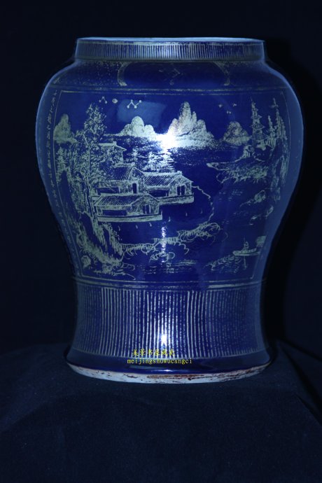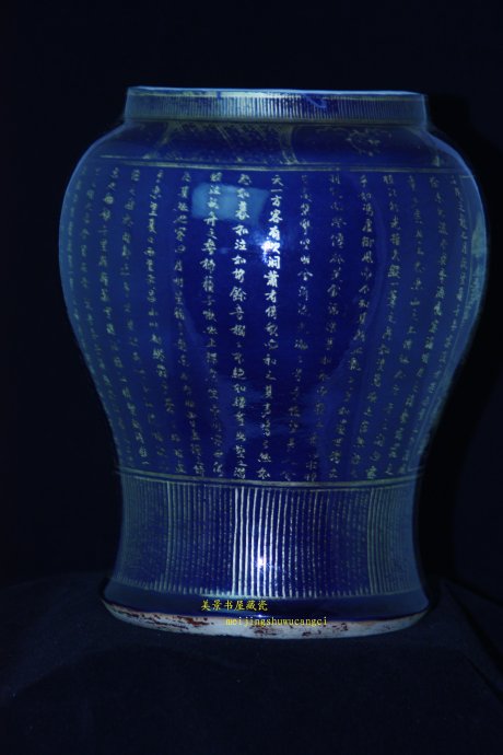 霁蓝釉是指在瓷器生坯上施含钴的釉,经约1300度高温一次烧成 。蓝釉最早出 现在唐三彩上。是一种低温釉。高温蓝釉始于元代景德镇,盛极于明宣德,由于色泽犹如蓝宝石,故也称“宝石蓝”,其光彩夺目.是单色釉中最名贵品种之一。应此类器物主要用以皇室祭祀,又称“祭蓝”。其色泽均匀稳定深沉蓝如海。装饰手法有浅刻或描金图案。清代康熙早期仿宣德霁蓝颇有成就,笔者收藏的此罐(见下图),可为康熙霁蓝描金罐精品力作。制作规整,造型大气,胎质细白,蓝色呈宝石蓝,金色纯正,细笔精描,山峦叠嶂,江水浩瀚,人舟同流,树木房舍,简练流畅。另一面为书法,抄录苏轼全文“前赤壁赋”,楷书秀美,功力深厚。画美字秀,相得益彰。给人以无尽想象空间和超凡脱俗之心境。
