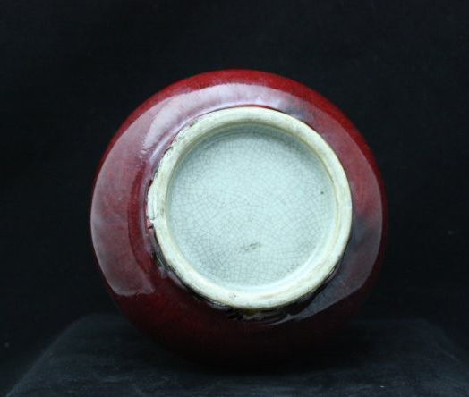 鉴赏要点:以下特征是鉴定郎窑红的主要方法。一,“脱口,垂足,郎不流”。脱口,即口沿处应红釉流淌下垂,出现轮状白边,俗称“灯草边”。垂足,郎不流,即红釉垂流至足,说明郎窑红瓷器的底足旋削讲究,保证流釉不过足。二,“米汤底”或“苹果绿底”。凡郎窑红瓷器其底部呈如米汤或苹果绿(青)色。偶有本色红釉底。凡白釉底,不属郎窑。三,器物内外开片,釉面透亮,有玻璃质感。底部有色无款。凡有款的也非郎窑。四,郎窑红的器型以文房用具等为多见,其中太白尊,观音尊是康熙朝的典型器。康熙郎窑红属于官窑烧制。