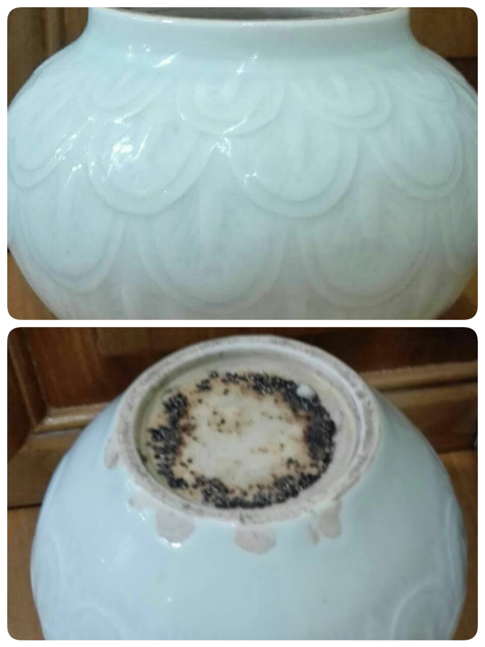 二.从湖田窑瓷器底足上看。真品青白瓷很少有底满釉的(复烧多满釉),多为垫烧,由于胎土细洁,所以垫烧处多有黑褐色色斑。而仿品胎土不致密,黑褐色色斑多为人为做旧,很不自然且胎足发软,为提高档次还多有满釉现象,满釉但无神。