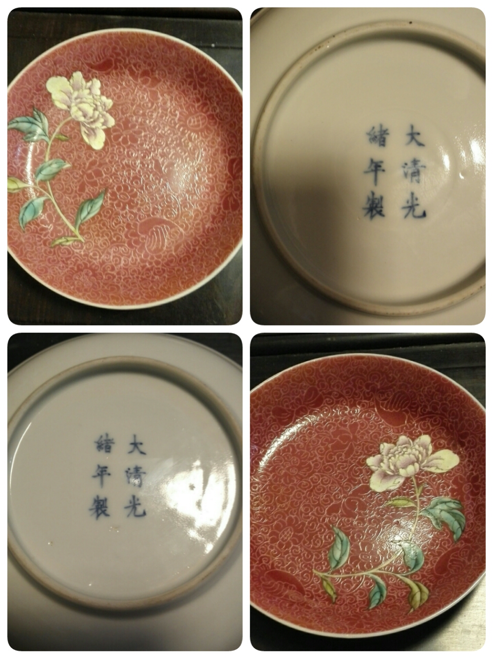 (本网讯 孙珉)最近,清华雅集主任李欣老师偕同孙珉、黄莲子、杨勇峰、王晓,应邀参加湖南安化第四届黑茶文化节。回沪途径长沙时,利用午餐午休时间,来到长沙古玩市场淘宝。在一家古玩店中,李欣老师看到一对胭脂红地轧道缠枝莲粉彩牡丹花纹盘,让店主从玻璃柜中取出,放在手上细细端详,此盘造型规整,白釉温润,胭脂红纯正,轧道工艺精湛,粉彩雅丽,底款青花“大清光绪年制”楷书款,书法秀丽,功底深厚。总体上感觉有清晚期官窑的风韵。经讨价还价,李欣老师以低廉的价格收入包中,为清华雅集艺术品宝库中增添了新的佳品。