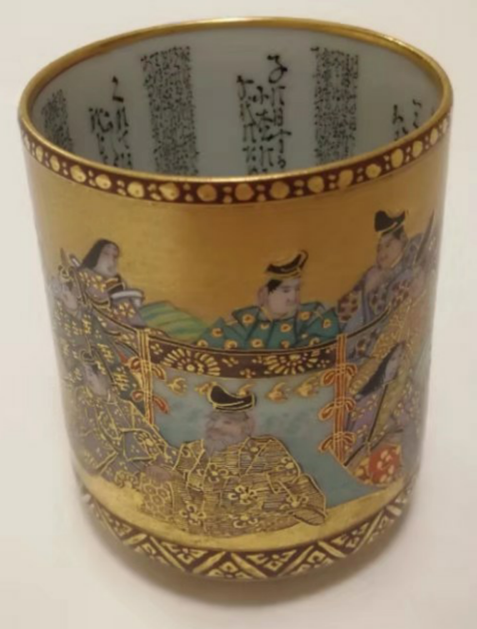 (本网讯 孙珉)近期,清华雅集举行日本国文化与淘宝之旅活动,有28位会员高高兴兴地参加。在大江古玩市场,会员宋梅珍,在一个摊位看到一件十分漂亮的彩绘描金人物纹笔筒,上有日本人物、花草,内有人物与墨彩书法诗句等纹饰,非常精美,鎏金富丽堂皇,底落款直书“锦光山”。十分喜欢,经讨价还价,最终如意收入囊中。