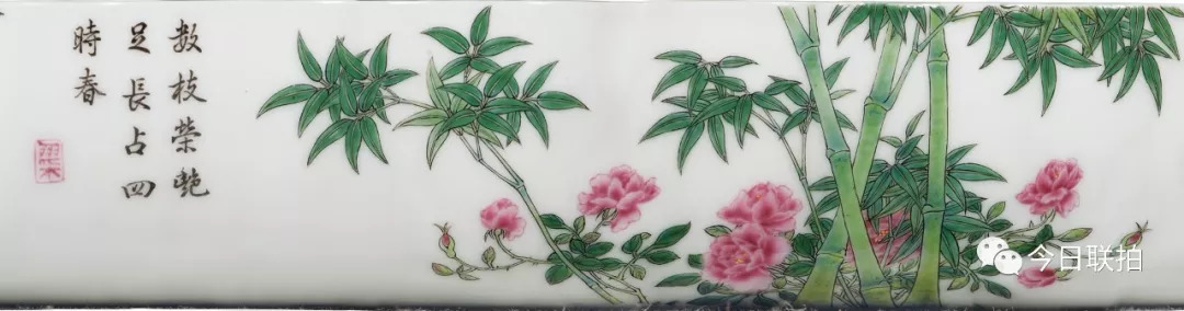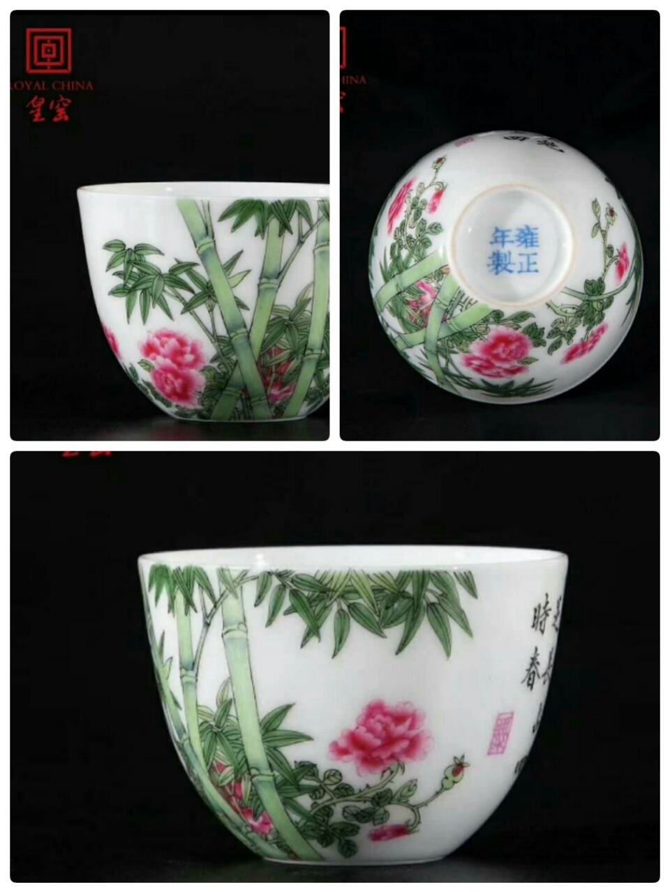 图为清华雅集收藏的黄云鹏大师高仿清雍正珐琅彩红花绿竹诗句文小杯